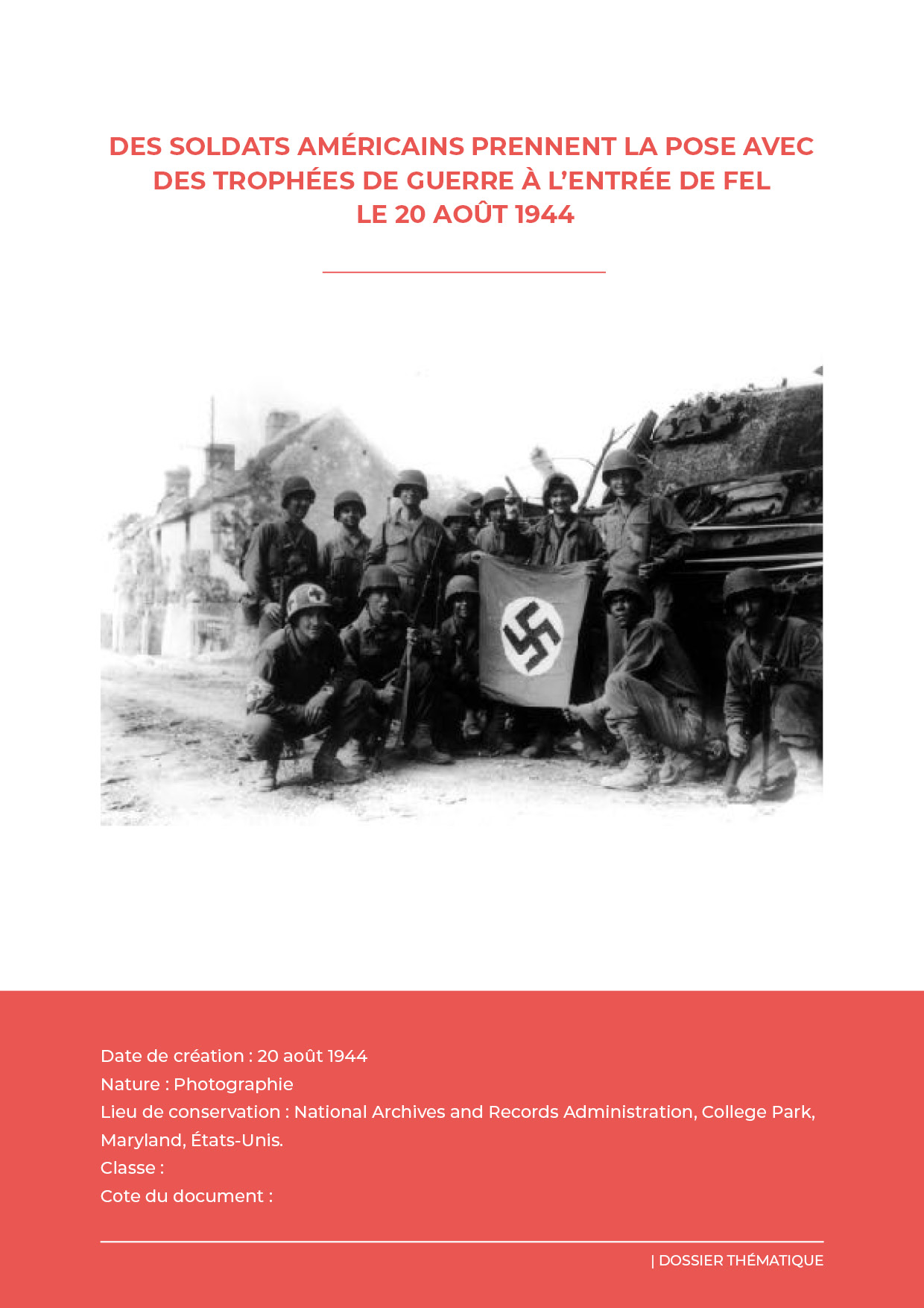 Des soldats étasuniens prennent la pose avec des trophées de guerre à l’entrée de Fel, le 20 août 1944